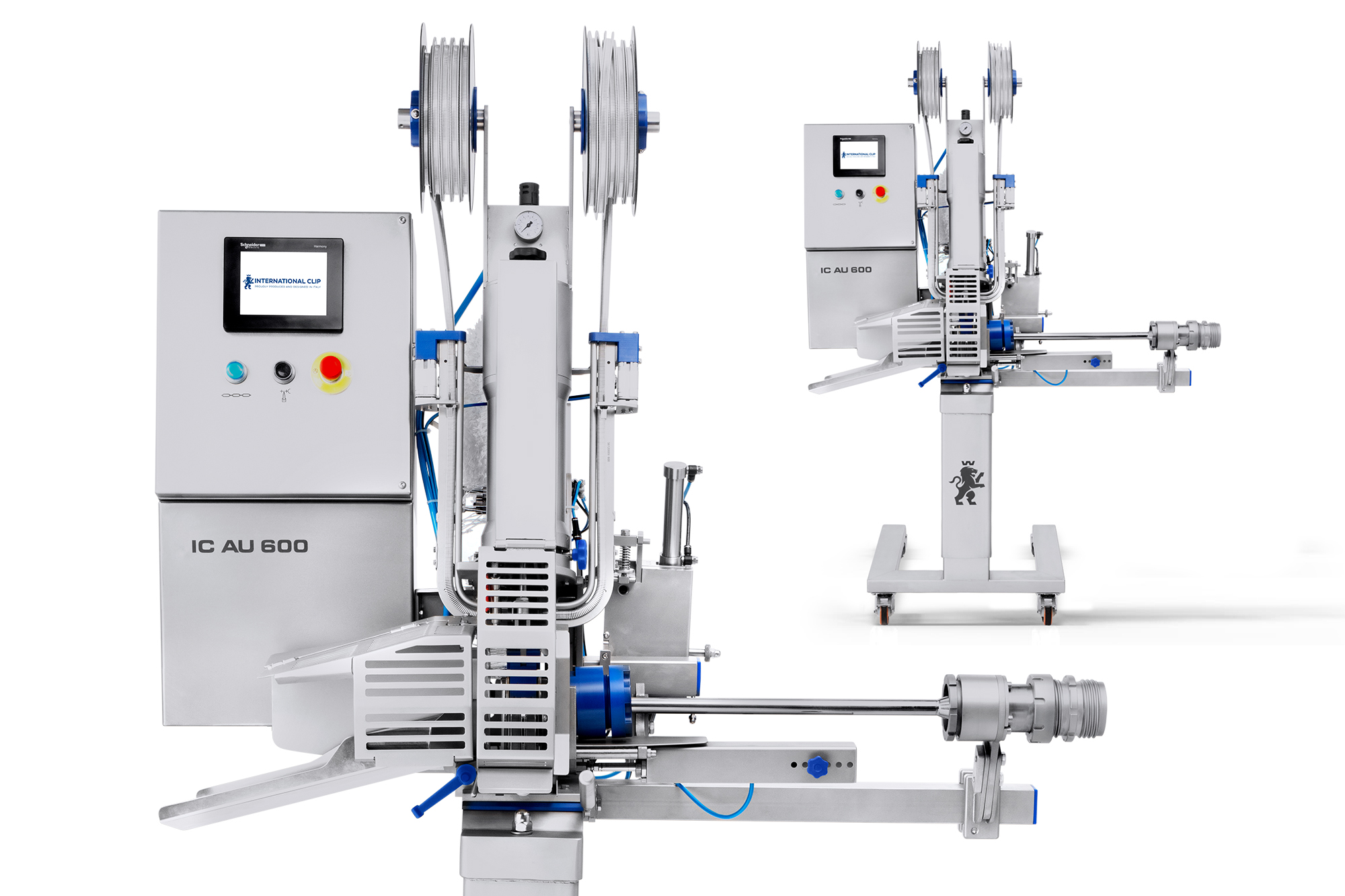 The IC AU600 Double Automatic Clippers in standard version is able to work with S-clip on spools with pneumatic clip feed, are entirely in stainless steel and are equipped with: Touch screen control panel (in different languages), pneumatically operated casing brake holder, pneumatic knife, comfortable height adjustment.